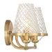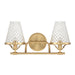 Infuse a bathroom with the vintage-inspired charm of the Candler 2-light bath bar from Savoy House. Two shades of tapered clear glass showcase a diamond pattern that adds texture, heightens the drama and recalls beautiful antique glassware. Warm Brass finish. Candler is 8.75" in height, 16.5" in width and extends 7.5" from the wall. Uses two candelabra size bulbs of up to 60 watts per bulb. Bulbs not included. This bath light is damp area rated and must be installed as shown.