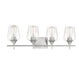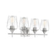 In the Savoy House Octave 4-light bath bar, bold light-colored lines and a streamlined silhouette create an air of elegance and sophistication. The satin nickel finish and clear glass shades go with absolutely everything. Whether you have transitional, contemporary, bohemian or other decor styles in your bath, you'll love the way this Octave fixture stylishly blends in. The bath bar is 28.75" wide, 9.5" high and extends 5.5" from the wall. The curved glass shades have a graceful, uncluttered look and four 60W standard size bulbs provide lovely light above the vanity. Plus, it may be mounted as either uplight or downlight, creating a sleek and clean choice for your bathroom or powder room.