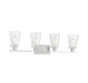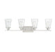 If you want a fresh, elegant lighting look in your bathroom, the Savoy House Vaughan 4-light bath bar is the perfect choice. Its sleek design showcases tall fluted shades of clear water glass that are held snugly in place with clasps and screws. The satin nickel finish works beautifully with many different colors of bathroom furnishings and hardware. This fixture is 32.5" wide and 9.25" tall. It extends 6" from the wall. Uses 4 standard size bulbs of up to 60 watts each (not included).