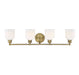 From Savoy House, the Melrose 4-light bath vanity bar stylishly updates classic Americana design for today's interiors. It features modern lines, white opal glass shades and a warm brass finish. It may be mounted as either uplight or downlight. Bath bar lights are a classic choice for illuminating vanity mirrors in bathrooms big and small. The warm brass finish can be paired with brass hardware or mixed with hardware in other finishes. Bring Melrose into bathrooms of traditional, transitional or classic style to improve the look and the lighting. When you choose a Savoy House lighting fixture, you can be certain you've selected a piece that will withstand the test of time.