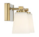 Add a relaxing spa feeling to any bathroom with the Savoy House Darby 2-light bath vanity light! White glass shades offer up a soft yet flattering glow while a matching pane of white glass creates a serene floating effect. Finished in warm brass. Darby is 8" in height, 15.25" in width and extends 7" from the wall. Uses two standard size bulbs of up to 60 watts per bulb (bulbs not included).