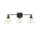This Savoy House Drake 3-light bath bar has an alluringly simple style with a few choice hardware details and shades of clear glass. It may be mounted as either uplight or downlight. Bath bar lights are a classic choice for illuminating vanity mirrors in bathrooms big and small. Because the bulbs are exposed, try using stylized bulbs (not included) such as Edison for a different look! The matte black finish can be paired with black hardware or mixed with hardware in other fixtures. Add Drake to industrial, transitional or contemporary rooms for a bold look. When you choose a Savoy House lighting fixture, you can be certain you've selected a piece that will withstand the test of time.