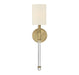 Slim and stylish! This Savoy House Fremont 1-light sconce packs a whole lot of textural interest into one slender silhouette. The round wall plate and light arm have double ring detailing and a warm brass finish. The long tail of that arm is made of clear glass with a double ring above the glass ball finial. The cylindrical shade is a lovely soft white fabric. Altogether, it's an elegant fixture that is a pleasure to have in your home. One 60W candelabra size bulb fits within the shade of this 5" wide and 21" high sconce. It's the perfect size to place alone, in pairs or in groups along the walls of your dining room, kitchen, living room, entryway, bedroom, bathroom, office, family room, media room or hallway.