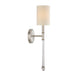 Slim and stylish! The Savoy House Fremont sconce packs a whole lot of textural interest into a slender silhouette. The round wall plate and light arm have double ring detailing and a satin nickel finish. The long tail of this arm is made of clear glass with another double ring above the glass ball finial. The cylindrical shade is a lovely, soft white fabric. Altogether, it's an elegant fixture that is a pleasure to have in your home. A 60W candelabra size bulb fits within the shade of this 5" wide and 21" high sconce. It's the perfect size to place alone or in groups along the walls of your dining room, kitchen, living room, entryway, bedroom, bathroom, office, family room, media room or hallway.