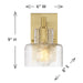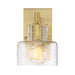 The Savoy House Dover 1-light sconce showcases standout bathroom lighting style! A clear glass shade features a beautifully textured pattern that recalls ocean waves. This glass shade is held to the base by an arm that is finished in Warm Brass and decorated with visible hardware to add a hint of vintage inspiration. Dover is 9" in height, 6" in width and extends 8" from the wall. It uses one standard size bulb of up to 60 watts. Bulb not included. Install as pictured. This sconce is damp area rated.