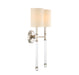 Slim and stylish! The Savoy House Fremont sconce packs a whole lot of textural interest into a slender silhouette. The round wall plate and light arms have double ring detailing and a polished nickel finish. The long tail of these arms are made of clear glass with another double ring above the glass ball finials. The cylindrical shades are a lovely, soft white fabric. Altogether, it's an elegant fixture that is a pleasure to have in your home. Two 60W candelabra size bulbs fit within the shades of this 13" wide and 21" high sconce. It's the perfect size to place alone or in groups along the walls of your dining room, kitchen, living room, entryway, bedroom, bathroom, office, family room, media room or hallway.