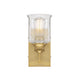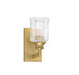 The stunning shade of thick clear crackle glass is the star of the Savoy House Hampton 1-light wall sconce. So as to let the star have center stage, the rest of the structure is kept deliberately understated. This makes it perfectly versatile for many different spaces and uses, ranging from lighting a hallway to boosting the illumination in a living room and much more. Offered in a rich warm brass finish. This fixture is 4.75" wide and 9.88" tall. It extends 6.5" from the wall. Uses a standard size bulb of up to 60 watts (not included).