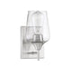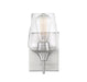 In the Savoy House Octave 1-light wall sconce, bold light-colored lines and a streamlined silhouette create an air of elegance and sophistication. The satin nickel finish and clear glass shade go with absolutely everything. Whether you have transitional, contemporary, bohemian or other decor styles in your home, you'll love the way this Octave fixture stylishly blends in. The sconce is 5" wide, 9.5" high and extends 6" from the wall. The curved glass shade has a graceful, uncluttered look and one 60W standard size bulb provides lovely light. You'll want to cluster several of these together for clean, casual style in your dining area, living room, kitchen, entryway, bedroom, bathroom, office, family room or hallway.