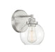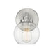 Adding the Savoy House Carson 1-light sconce easily helps you boost the illumination and the style of any room or space. Its fishbowl-style clear glass shade makes a big statement and is open at the bottom, making it easy to replace the bulb. The streamlined structure offers up subtle detailing with a mid-century modern vibe and the circular backplate echoes the shape of the glass shade. Finished in satin nickel. Carson is great for bathrooms, hallways, bedsides, stairways, kitchens and more. This fixture is 5.5" wide and 8.5" tall. It extends 7" from the wall. Uses a standard size bulb of up to 60 watts (not included).