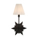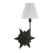 A starburst-shaped backplate shines beautifully in this Savoy House Crestwood 1-light sconce, creating a lovely look that imparts any space with a touch of midcentury-inspired style. The white pleated shade and Black Tourmaline finish are a perfect pairing. Crestwood is 15.75" in height, 8" in width and extends 9.5" from the wall. Uses one candelabra size bulb of up to 60 watts. The bulb is not included. Damp area rated.