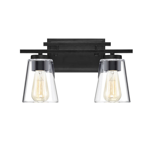 Brighten up your bathroom vanity with the sleek look of the Savoy House Calhoun 2-light bath bar. Its tapered clear glass shades and matte black fi...