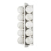 Drawing inspiration from Art Deco jewelry design and playing with shape, symmetry and repetition, this chic sconce features pairs of alabaster globes on a rectangular metal backplate separated by a metal spine at the center. The globes reflect off the Vintage Brass or Polished Nickel finish, creating a mirror-like feel and the alabaster gives off a soft light.