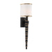 Add elegance and sophistication to a room with the Sloane vibrant gold and black forged metal wall sconce. It's elongated tapered arm, and cylindrical white silk shade is an effortless way to add visual interest to your wall.