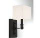 The square has never looked so stylish. This Collins 1-light wall sconce showcases a cubic shade of white fabric paired with a backplate finished in matte black. Collins is 11.5" in height, 5.5" in width and 6.25" in extension. It uses 1 candelabra size bulb of up to 60 watts (bulb not included). Damp area rated.