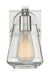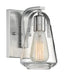 The clear glass goblet shade on the Skybridge highlights the Brushed Nickel finish on this one-light vanity light. The unique saddle style glass holder and geometric lines complement any transitional, contemporary or modern design. 5 inches in width by 8.375 inches in height, the Skybridge vanity light is damp rated and is the perfect light source as a hall sconce or flanking the bathroom mirror.