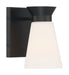 The Caleta one-light wall sconce is an elegant lighting solution for inside the home. Clean lines offset the asymmetry of the frosted white glass shade and brings modern style to any space. The black frame and white shade are a balanced and simple design that is appealing and understated. This versatile fixture is perfect for multiple applications.