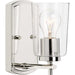 Create a haven for relaxation and revival with the Adley one-light bath. This fixture features a Polished Nickel, curved backplate attached to a simple, clear glass shade. The modern piece is perfect for adding ambient light to bathroom and vanity settings in traditional and transitional interiors.