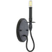 This versatile wall bracket from the Durrell Collection will easily find a home in a variety of settings in need of generous illumination. A light base reminiscent of a vintage candlestick is coated in a beautiful black finish. Beneath the light base, a decorative wooden piece coated in a cerused black finish tops a long, curving metal arm. The arm attaches to a round black backplate with a faux-painted wooden center for a mixed-elements aesthetic.