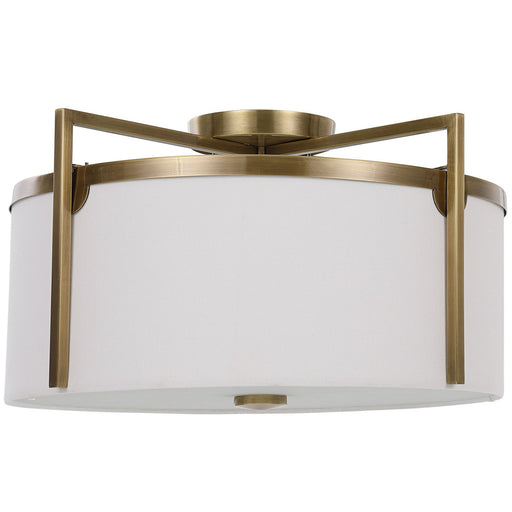 Chic And Versatile With Clean Lines This 3 Lt. Semi Flush Mount Features An Antique Brass Finish With Off-white Linen Hard Back Shade With A Centra...