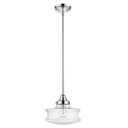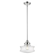 Schoolhouse design. Use as a ceiling mount or a pendant. Polished Nickel finish is easy to mix and match with other hardware. As a pendant, use multiples for extra impact.