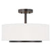 The Nance two light indoor semi-flush convertible in bronze supplies ample lighting for your daily needs, while adding a layer of today's style to your home's décor. The mid-century inspired Nance lighting collection by is a versatile transitional design which fits in a wide array of traditional or contemporary settings. The tapered, off-white, faux silk shades add warmth and sophistication. The large pendant and semi-flush faux silk drum shades are complemented nicely with Satin Etched Opal glass diffusers to soften the downlight. In either of the available Brushed Nickel or Heirloom Bronze finishes, all the Nance fixtures are timeless additions to any foyer, kitchen or dining area. The assortment includes three- five- and nine-light chandeliers, a one-light wall sconce, two- and three-light bath vanities and a two-light semi-flush convertible drum pendant. Incandescent and ENERGY STAR-qualified LED lamping are available, all fixtures are California Title 24 compliant.