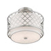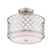 Our Arabesque two light semi flush mount will add refined style and a hint of mystery to your decor. The off-white fabric hardback shade creates a warm illumination, while the light brings to life the intricate brushed nickel cutout pattern.