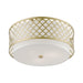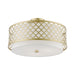 Our Arabesque three light semi flush mount will add refined style and a hint of mystery to your decor. The off-white fabric hardback shade creates a warm illumination, while the light brings to life the intricate soft gold cutout pattern.