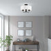 The three-light Brookdale semi-flush combines floral details and casual elements to create an updated look. The hand-crafted off-white fabric hardback drum shade is set off by an inner silky white fabric that combines with chandelier-like black finish sweeping arms which creates a versatile effect. Perfect fit for the living room, dining room, kitchen or bedroom.