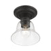 Whether it's style or practical lighting, this flush mount is the perfect addition to your bathroom or hallway. This single-light fixture from the Moreland Collection features a clear hand-blown glass shade and is shown in a black finish. The clean graceful lines of the canopy complement the shade, creating an understated look that works well in most decors. Classic elegance combines with contemporary appeal to enhance any home in style.