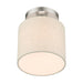 The Meadow collection is both modern and versatile. The hand-crafted fabric oatmeal colored hardback shade is set off by the silky white fabric on the inside setting a pleasant mood. The petite size single-light drum shade adds character to this handsomely styled semi flush. Perfect fit for the hallway, bathroom, kitchen and a small bedroom. This sleek design is shown in a brushed nickel finish.