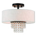 This contemporary style semi flush mount from the Carlisle collection features an English bronze finish with hanging strands of beautiful clear crystals. The crystal drapes from a hand crafted oatmeal fabric hardback shade and creates a magnificent sophisticated look.