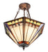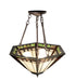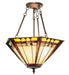 Inspired by the clean geometric lines of Southwest styling. This resplendent lighting design features diamonds and bands of Bark Brown granite glass on panels of Bone Beige and Moss Green. Hand-cut pieces of glass are wrapped in copperfoil and soldered together in the famous Meyda Tiffany tradition to make this handsome shade. This stunning fixture can be installed in entryways and dining spaces in fine homes and restaurants from Cedar Rapids, Iowa, to Buford, Wyoming. The Albuquerque Inverted Semi-Flushmount is featured in our American-designed, handcrafted Southwest Stained Glass Lighting Collection. Each shade is a unique work of art with color variations based on natural ingredients inherent in the glass.