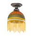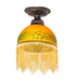 A charming, nostalgic ceiling fixture that is perfect for nearly any room. This Roussillon features a stunning Amber-Green Mottled Blown-Glass shade color coordinated with delicate Amber and Clear glass beaded fringe. Elegant cast metal hardware in a Mahogany Bronze finish embraces this Victorian-inspired shade. This ceiling fixture is perfect for placing above kitchen tables and throughout hallways in fine Victorian homes from Pawtucket, Rhode Island, to Albuquerque, New Mexico. The Roussillon Flushmount is featured in our American-designed, handcrafted Boudoir Lighting Collection. UL and cUL listed for dry and damp locations. Each shade is a unique work of art with color variations based on natural ingredients inherent in the glass.