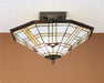 Native American patterns are a commonly used theme in the Southwest Mission style. The Meyda Tiffany Arrowhead Mission shade has a triple arrowhead and border in Bark Brown granite textured glass.. Intersecting bands of Sand Beige on Alabaster White complete this geometric stained glass shade which is suspended from simple linear flushmount hardware in Mahogany Bronze.