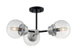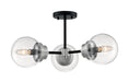 The three-light Axis semi-flush fixture has a distinct finish combination of Matte Black with 3 Brushed Nickel shade holders. The clear globes accent the minimalist appeal of this series. They will fit in a variety of design styles ranging from mid-century modern to clean contemporary designs. The fixture is 22.750 inches wide by 10.750 inches in length from the ceiling. This distinctive ceiling light will pop in any interior design.
