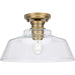 The Singleton Collection 1-light medium semi-flush mount fixture pays homage to industrial styling with an oversized warehouse shade fabricated from clear glass. A round backplate and vintage-inspired metal fittings finished in soft vintage brass create a timeless design. The warehouse-style glass shade is the perfect showcase for clear decorative light bulbs (not included) to enhance the fixture's charming style. This beautiful ceiling light delivers optimal ambient lighting for bathrooms, bedrooms, hallways and foyers.