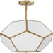 Charmingly distinctive, the Latham Collection glows from within. The large light is composed of a geometric framework finished in Vintage Gold that features an artful array of handmade white art glass. This versatile fixture can be mounted as a semi-flush mount or as a pendant. Inspired as a modern expression of an origami lantern, the light delivers striking illumination to spaces below.