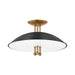 The striking, graphic feel of Larkin stems from its industrial shape, contrasting finishes, and decorative details. Finished in Soft Black, the large dome shade provides a bold counterpoint to the milky white glass diffuser. Three Patina Brass rods appear to pierce through the entire fixture like jewelry, giving this flush mount its modern edge.