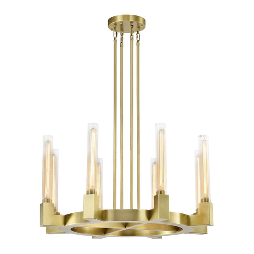 8-Light 32" Wheel Styled Chandelier with Clear Fluted Cylindrical Glass Shades Settled on a Round Aged Brass Metal Frame.Details:Product Type: Cage...