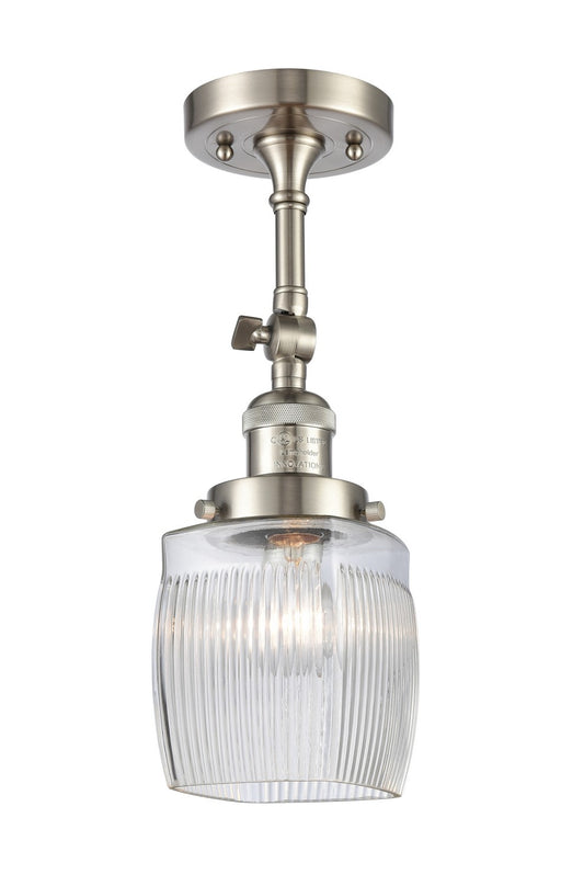 Colton - 1 Light - 6 inch - Brushed Satin Nickel - Clear Halophane Shade - Semi-Flush MountDetails:Product Type: DirectionalFinish: Brushed Satin N...
