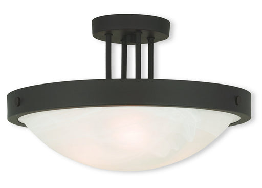 Classic and inviting, this semi flush mount works well with any style of decor. Finished in bronze with white alabaster glass for soft illumination...
