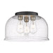 Kahana Collection semi-flush mounts are a transitional design in popular dual finish combinations. The large, flared dome shaped glass shade is suspended from a finely detailed black metal frame and contrasting metal finish canopy.