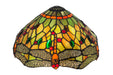 Inspired by one of Tiffany Studio's classic Dragonfly lighting masterpiece. Orange Dragonflies with glowing Red glass jeweled eyes and Multi-colored Filigree wings dive on a stunning Green and Orange background. The beautiful shade is accented with Red, Green and Amber glass jewels. The art glass shade is created using the famous Meyda Tiffany copperfoil construction. Ideal for embracing a base to create a gorgeous table/floor lamp or hardware to build a striking ceiling fixture.