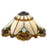 Oceanic Iridescent Blue/Green Jeweled nautical shells, surrounded by Blue and Red jewels, highlight an Art Nouveau motif in Amber and Clear Ripple glass, accented with iridescent Amber formed jewels on Bone Beige. A Multicolored ringlet motif featured on the bottom is accented with Amber oval jewels, while Amber diamond-shaped jewels accent the top. The shade is handcrafted using the famous Meyda Tiffany copperfoil construction process. Pair with a base to create a table or floor lamp, or with hardware to build a ceiling fixture. The Shell with Jewels Shade is featured in our American-designed, handcrafted Stained Glass Lighting Collection. Each shade is a unique work of art with color variations based on natural ingredients inherent in the glass.