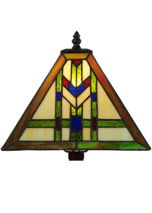 In the tradition of the Prairie School, organic objects were interpreted into geometric forms. Meyda Tiffany uses colorful interlocking blocks of W...