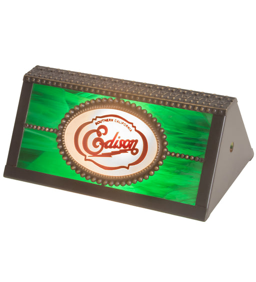 A stunning Banker's Lamp shade is personalized with the Edison Southern California logo in a Red hue. The shade features Emerald Green art glass an...