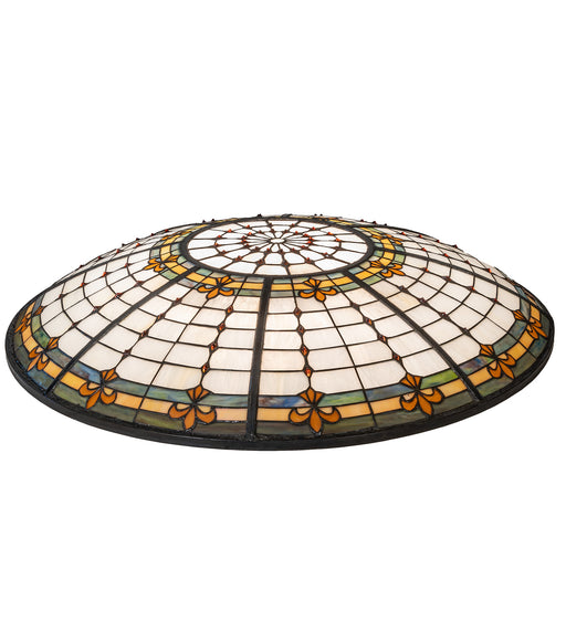 This curvaceous Fleur-de-Lite inverted shade is an elegant design featuring Golden stylized three-petaled irises with Amber colored jewels. A multi...