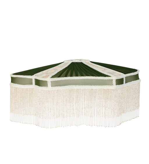 Hunter Green, Ivory and Pink floral damask-styled fabrics are accented with a Warm Ivory Trim, which is edged in long Clear and White Glass beaded ...