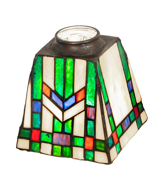 In the tradition of the Prairie School, organic objects were interpreted into geometric forms. Meyda Tiffany uses colorful interlocking blocks of W...
