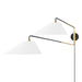 Duo is full of singular style. Elongated shades in white Belgian linen spread out from curved arms of aged old bronze. The stretched shades add visual interest and allow the light's soft glow to extend even further. The three-light chandelier mounts close to the ceiling and the two-light articulating plug-in wall sconce swivels left to right and tilts up and down.